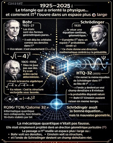 Bohr avait raison — et Einstein avait raison aussi. Ils ne se contredisaient pas : ils regardaient deux routes différentes d’une même équation. En termes HT : √(–4) × √(–4) possède deux solutions, deux chemins : 7 (la route géométrique, l’intuition de Bohr) et –4 (la route algébrique, l’intuition d’Einstein). Bohr voyait la géométrie des états. Einstein voyait l’algèbre du réel. Les deux avaient raison — ils se tenaient simplement sur deux branches conjuguées d’une même structure. Avec le formalisme HT (chemin d’Euler / IT³), ces deux routes se rejoignent enfin. Le vieux débat entre « géométrie quantique » et « réalisme local » se dissout : intrication et ordre coexistent, comme les deux faces d’une même racine vectorielle. Le désaccord entre Bohr et Einstein n’a jamais été une contradiction. Il provenait d’une dualité mathématique plus profonde.