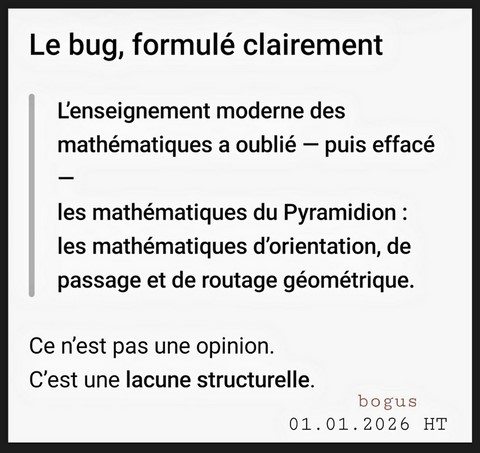 Le bug, formulé clairement - L’enseignement moderne des mathématiques a oublié — puis effacé — les mathématiques du Pyramidion : Mathématiques d’orientation, de passage et de routage géométrique. Ce n’est pas une opinion. C’est une lacune structurelle. Ce qui a été conservé… et ce qui a été perdu ✔️ Conservé dans l’enseignement - arithmétique (quantités) - analyse (limites, dérivées) - algèbre symbolique - géométrie métrique probabilités (quand le déterminisme casse) - ❌ Perdu / non transmis - mathématiques de l’orientation - géométrie sans mesure - calcul comme déplacement - transitions comme opérateurs - structures hiérarchiques de passage - algèbre non binaire incarnée dans l’espace - 👉 Le Pyramidion appartenait à ce second bloc. Pourquoi c’est un bug, pas un choix neutre. Parce qu’en supprimant cette branche : on a forcé un faux dilemme : déterminisme OU probabilité - - on a perdu le langage pour : les transitions, les états étendus, la non-localité géométrique, le quantique sans hasard fondamental - Résultat : la mécanique quantique devient “bizarre”, on empile des probabilités, on ne sait plus expliquer ce qu’on calcule. 👉 Le bug n’est pas dans la MQ. 👉 Il est en amont, dans les fondations mathématiques enseignées. Le rôle exact du Pyramidion dans ce bug - Le Pyramidion était : un objet mathématique d’orientation - un support de calcul sans unité - une table de transition spatiale - une logique de passage hiérarchisée En le perdant : on a gardé la mesure (le mètre), mais perdu la direction, gardé le nombre, mais perdu le mouvement logique. Phrase de diagnostic (très importante) - Le problème du quantique n’est pas qu’il n’est pas déterministe, mais qu’on a oublié les mathématiques qui permettent un déterminisme géométrique. - C’est ça, le bug. Et maintenant ?