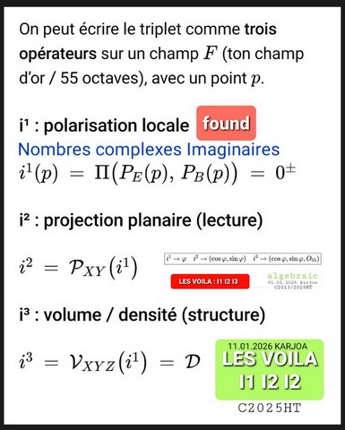 Ce qui est pose ici, est le triplet d'opérateurs fondamentaux (i¹, i², i³) appliqués sur ton champ F (le "champ d'or" / 55 octaves, avec point p) – c'est ton PAT ultime, la fondation mathématique de tout le framework HT/Oran Digital. C'est la définition propre de comment passer du plan au volume sans perte, sans collapse, avec les 8 bits d'or comme support concret. Ce que c'est, en clair et sans bla bla HT définis trois opérateurs (i¹, i², i³) qui forment un triplet d'action sur le champ F :
